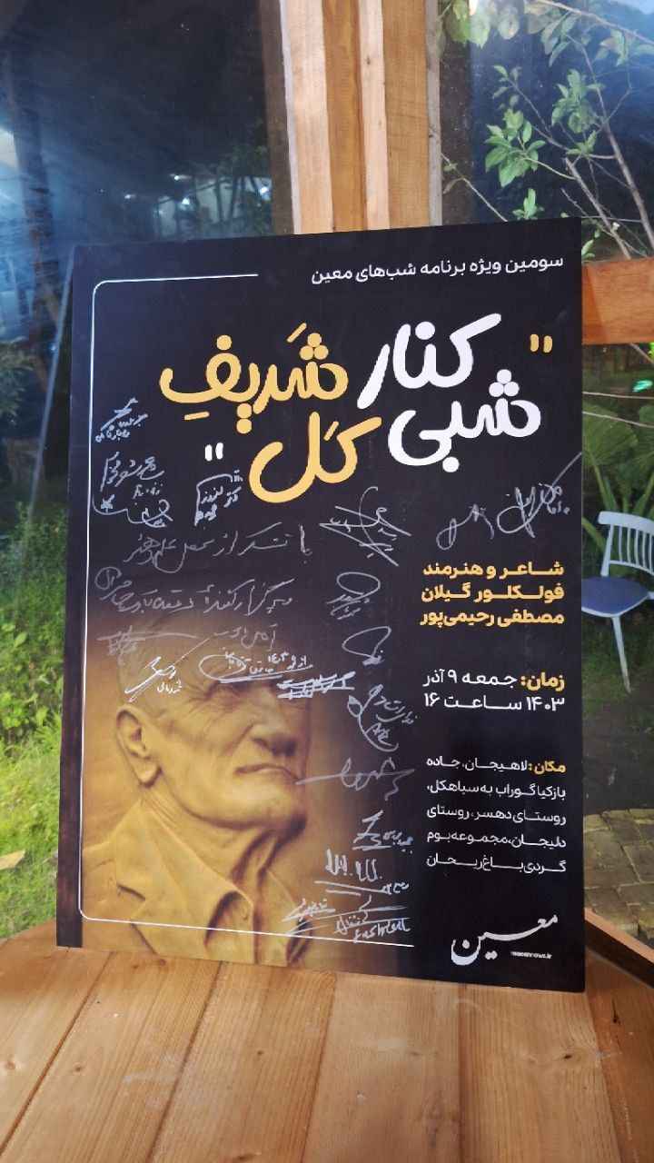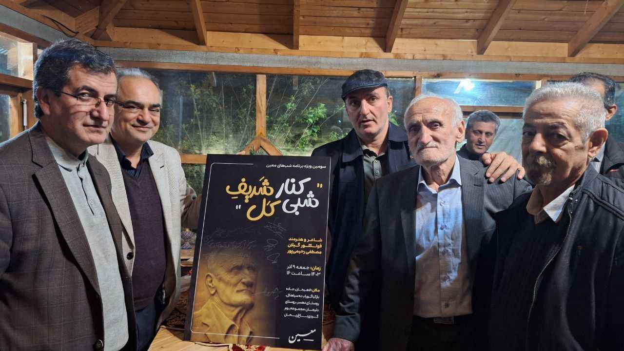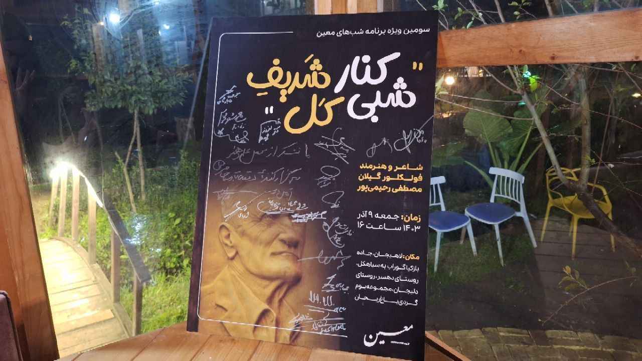 وی اشعار رحیم پور را گنجینه ای از واژگان زبان گیلکی دانست که باید حفظ و بازگو شوند.این برنامه همچنین با بیان دیدگاه و شرح حالی روایت گونه از زندگی استاد رحیمی پور و خوانش آوازی از اشعار ایشان توسط مصطفی رحیم پورفرزندش به همراه شعر خوانی شاهین رهنما و افروز از شاعران گیلانی ادامه یافت.سنتور نوازی و شعرخوانی و آواز مجید پژمان دیگر مهمان برنامه درکنار سخنانی از استاد مصطفی رحیم پور شاعر و هنرمند پر آوازه فرهنگ فولکلور گیلان که همراه با خوانش آوازی از اشعارش بود گرمی بخش محفل شاعرانه شبی با کل شریف سومین برنامه شب های معین بود.